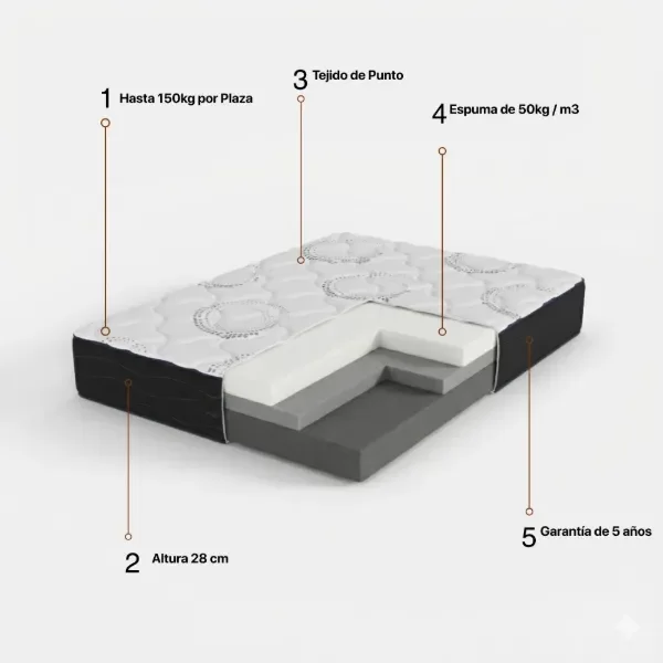 Perfecto para un descanso robusto y de larga duración, con el núcleo compacto de 50 kg/m³ potenciado por un sommier que eleva su presencia y funcionalidad. El Conjunto Pampa Plus ofrece resistencia industrial, una superficie de descanso higiénica y ventilada por la base, y una sensación de soporte rígido, ideal para quienes buscan una cama que se mantenga como nueva por años.