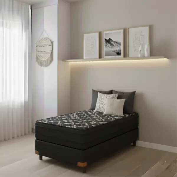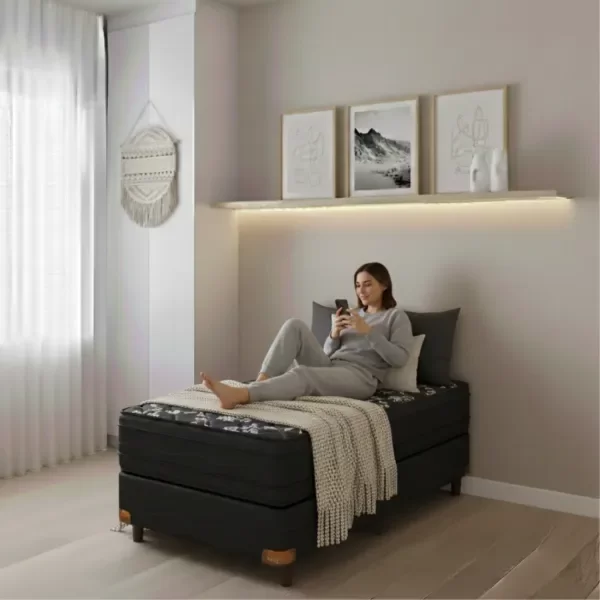 Este conjunto transforma visualmente cualquier habitación. Al tener un colchón alto con Pillow Top sobre la base rígida, la cama se convierte en el punto focal del dormitorio, ofreciendo no solo un descanso ergonómico para hasta 100 kg, sino una estética de "cama de hotel" que los colchones bajos no pueden igualar.