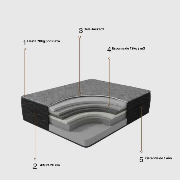 Perfecto para equipar habitaciones de huéspedes o casas de fin de semana, con la flexibilidad de la espuma de 19 kg/m³ y una presentación prolija en tela Jackard. El modelo Matelasse Plus ofrece un descanso placentero para pesos ligeros, una estética clásica y una sensación de suavidad envolvente, ideal para recibir visitas con comodidad.