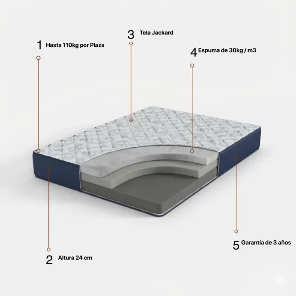 Perfecto para quienes priorizan la salud de su espalda, con el soporte ergonómico de la espuma de alta densidad (30 kg/m³) y una amplitud confortable. El modelo Zafiro ofrece una base sólida, gran capacidad de recuperación y una sensación de firmeza terapéutica, ideal para quienes buscan despertar sin rigidez muscular.