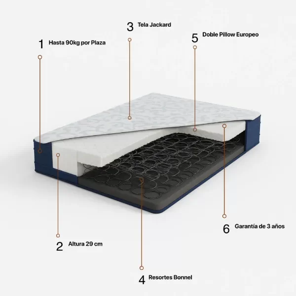 Este modelo soluciona el problema de la "dureza" en los colchones de resortes tradicionales. El Doble Pillow actúa como un amortiguador entre tu cuerpo y la estructura de acero, eliminando los puntos de presión en caderas y hombros, lo que te permite disfrutar de la frescura de los resortes sin sacrificar la comodidad superficial.
